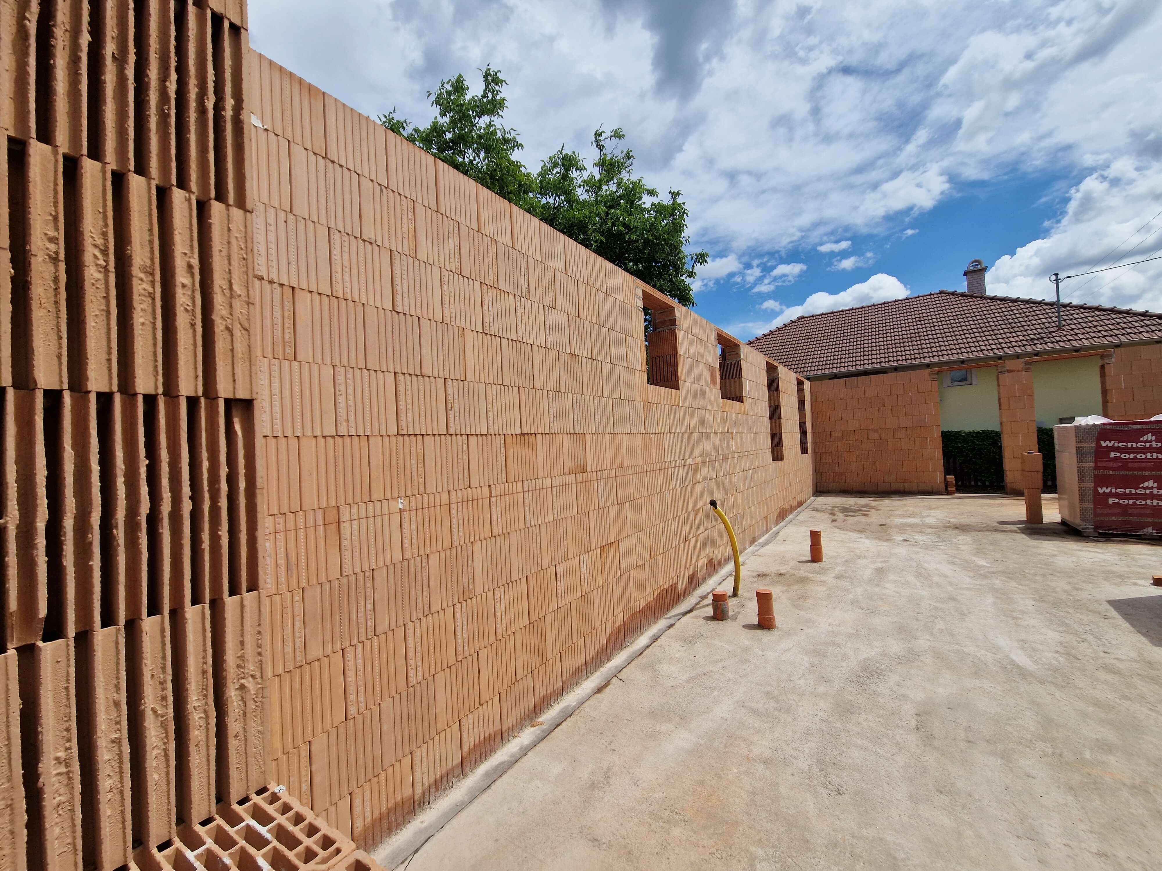 A külső teherhordó falakat 11 sor Porotherm 30 N+F Rapid csiszolt téglából készítjük. Amely technológia fő előnye, hogy minimális vízfelhasználást igényel, így a falak könnyebben ki tudnak száradni, így kisebb a kockázata a penészgomba megjelenésének. Továbbá a kivitelezés is sokkal gyorsabb, mint hagyományos tégla esetében. A falak alá bitumenes vízszigetelő lemez kerül.