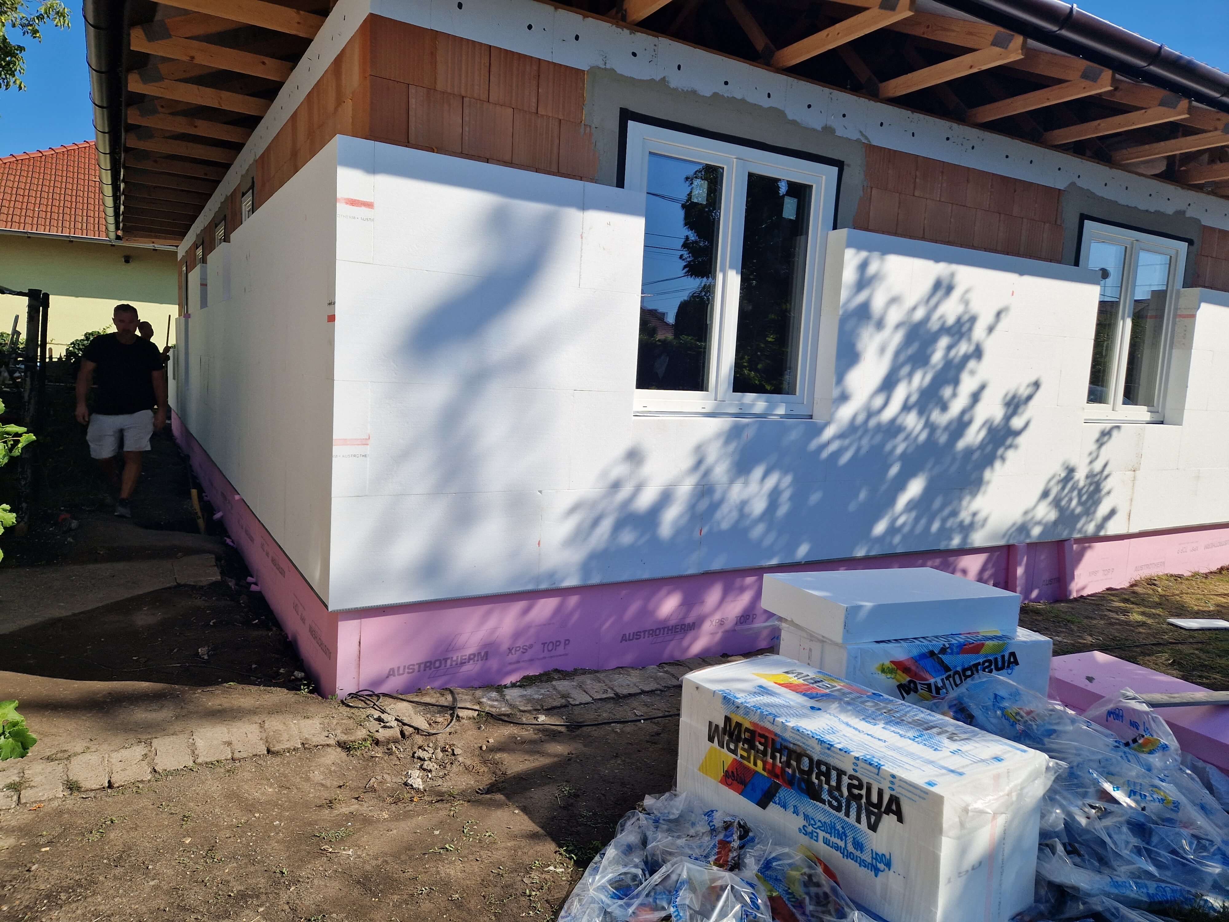Választott csomagtól függően, hagyományos fehér vagy grafitos EPS homlokzati hőszigetelést készítünk 15-20 cm vastagságban, üvegszövet hálóval, dűbelezve, telepítési útmutató szerint, 2 mm-es kapart nemesvakolattal színezve. A lábazaton 10-15 cm vastag XPS szigeteléssel.